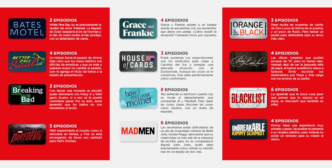 Netflix analizó los datos* globales de streaming (transmisión de datos por Internet), a nivel mundial, de las primeras temporadas de algunas de las series más importantes de la actualidad, incluyendo series originales de Netflix y otras series estrenadas por otros canales, con la intención de encontrar indicadores de los momentos en que los espectadores se engancharon. Resulta que cuando los anuncios publicitarios y los horarios fijos de programación desaparecen, y además los consumidores pueden elegir ver una temporada completa como quieren, se puede ver como nacen los nuevos fanáticos de una serie. Dicho de otra forma, el 70% de los espectadores que vieron el episodio ‘gancho’ continuaron y completaron la primera temporada, es decir los miembros se engancharon y no hubo marcha atrás.